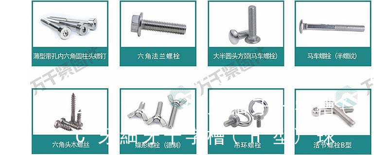 B.S.F. 標準惠氏細牙系列,一般用途圓柱螺紋 (英制牙)fine pitch thread 細牙 full thread 全螺紋 3 螺絲頭型 IHH=ind hex head 鋸 六角頭 PH=phillips 十字槽 Pan 圓頭(盤頭)Oval 半沉頭 H.W.H.. 六角小法蘭 螺栓有:1、方頭螺栓,2、半圓頭方頸螺栓,3、十字槽盤頭螺釘,4、內六角沉頭螺釘,5、方螺母C級,6、蝶形螺母,7、六角頭螺栓,8、十字槽盤頭自攻螺釘。大小有M18、M6、M8、M16、M10、M12、M14、M20等型號。通常用